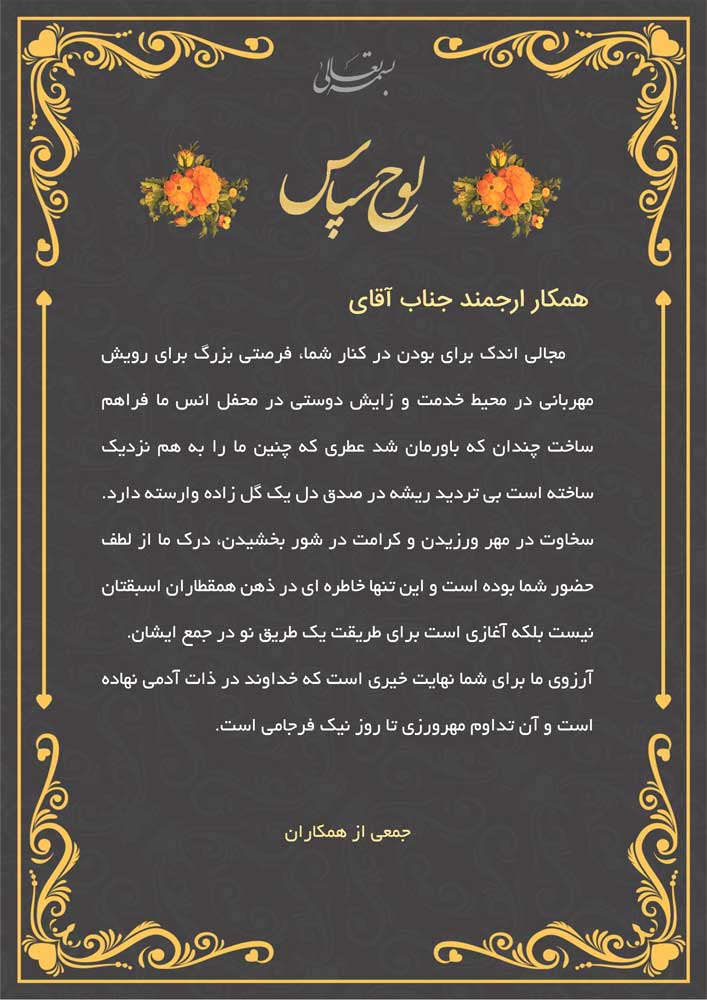 این لوح سپاس معلم، نمادی از قدردانی و احترام به زحمات بیپایان معلمان عزیز است. هر یک از ما خاطرات و تجربیات ارزشمندی با معلمین خود داریم که نهتنها در حوزه علمی، بلکه در زندگی و تربیت ما نقش بسزایی ایفا کردهاند.