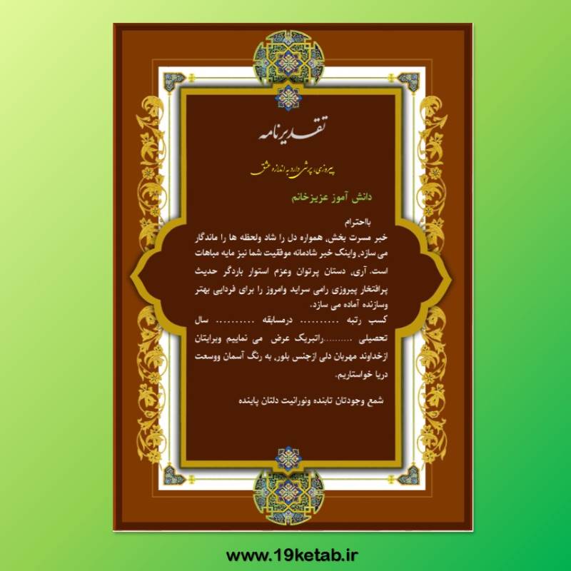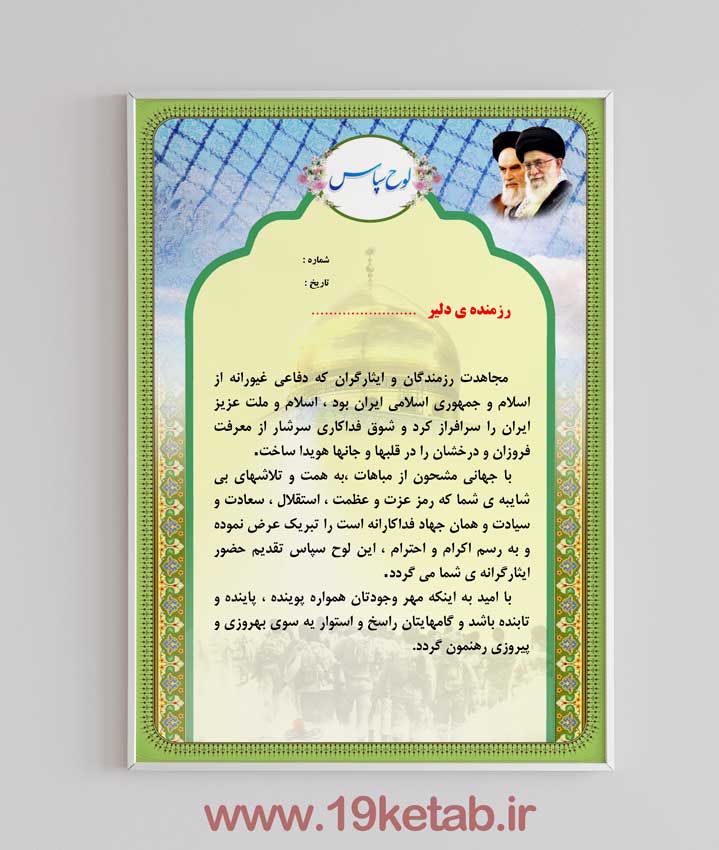 طرح لوح سپاس با زمینه سبز و حاشیه زیبای اسلیمی با فرمت ورد (word) و کیفیت فوق العاده بالا با ابعاد A4.ابتدا فونت های موجود در فولدر را در قسمت فونت های کامپیوتر خود کپی کنید.